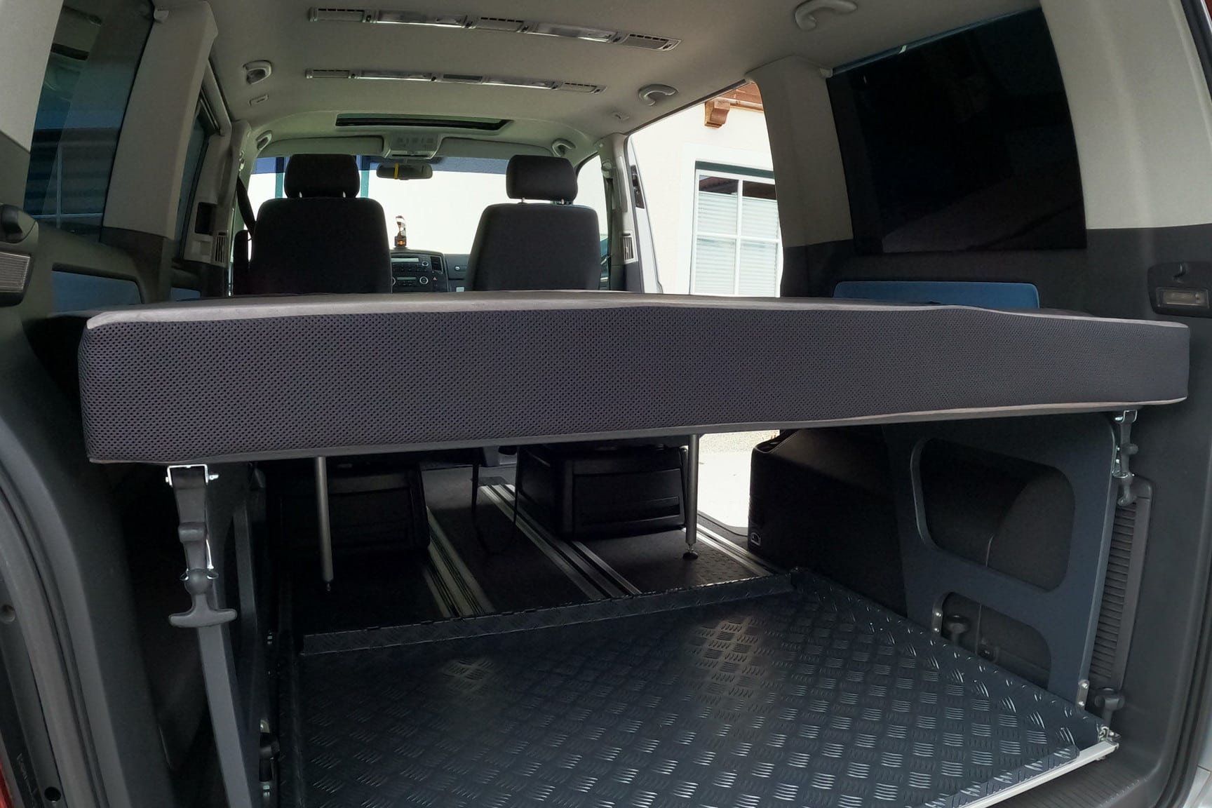 Das Multiboard ist ebenfalls kompatibel mit der Kitchenbox und dem Heckauszug, ist aber auch als Standalone-Lösung nutzbar, um die Schlaf-/Lounge-Funktion im Van nutzen zu können. Bei Nutzung des Heckauszug wird die Höhe zwischen Auszug und Multiboard auf 49,5 cm beschränkt. Das genügt für eine Eurobox oder auch eine mobile Kitchenbox von Go-Outside.