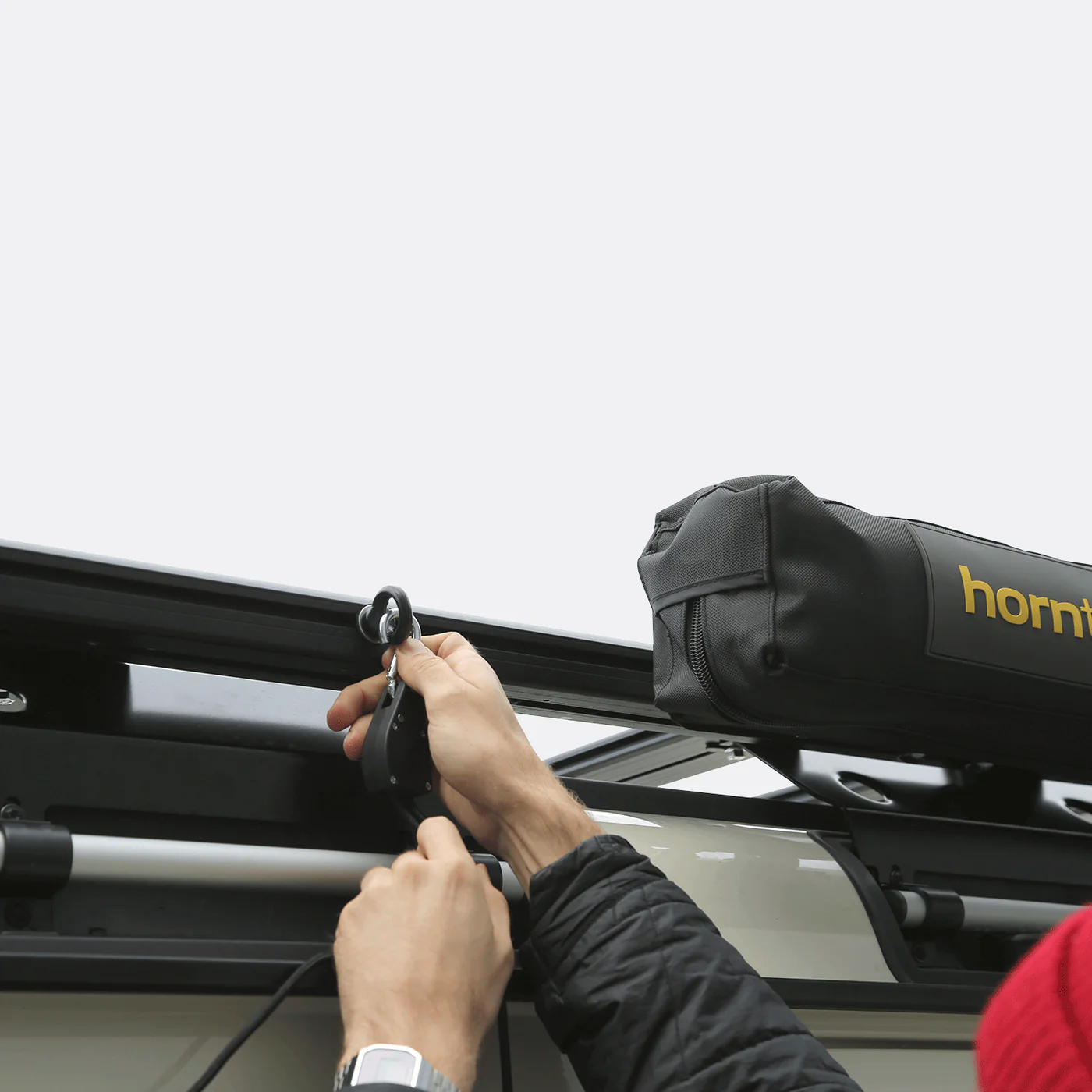 Die Horizon Markise passt sowohl auf den ExRoof DachtrÀger als auch auf TrÀgersysteme anderer Marken. Die universale Markisenhalterung ermöglicht eine einfache und passgenaue Installation.
