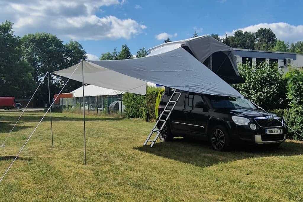 Die Montage des Layzee Sonnensegels ist denkbar einfach. Dank des entspannten Clipsystems kannst du das Sonnensegel in Sekundenschnelle an dem Dachzelt befestigen. Anschließend musst du es nur noch abspannen und schon hast du einen großzügigen Schattenplatz vor deinem Zelt.
