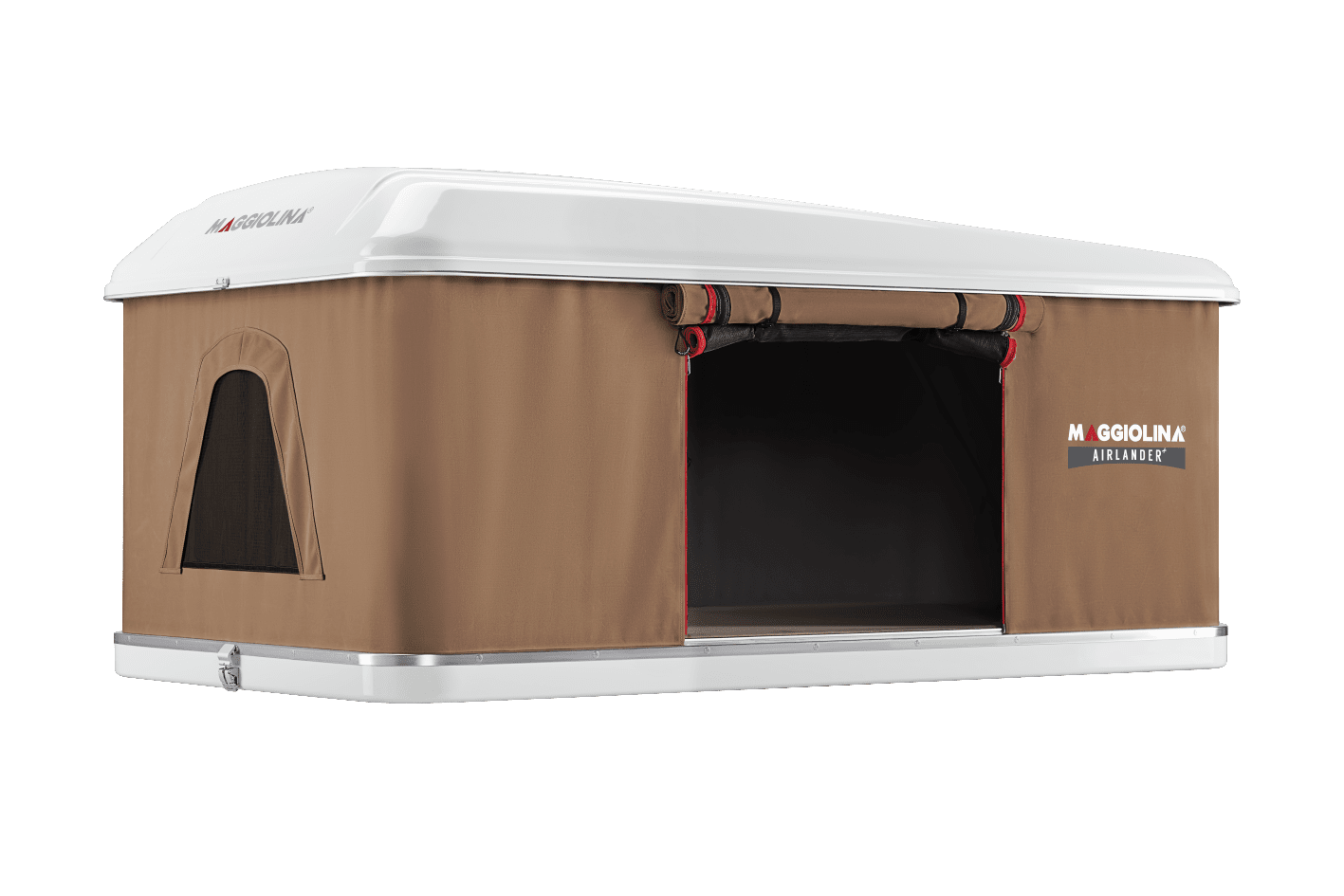Das Topmodell der Maggiolina-Serie verfügt im Vergleich zum klassischen Airlander über zusätzliche Extras und Ausstattungen. Die Eingänge können so geöffnet werden, dass sie sowohl Sichtschutz bieten als auch eine bessere Luftzirkulation ermöglichen. Bei Bedarf können die oberen Bereiche der Eingänge auch als Luftklappen dienen, um Kondenswasserbildung zu verhindern.
