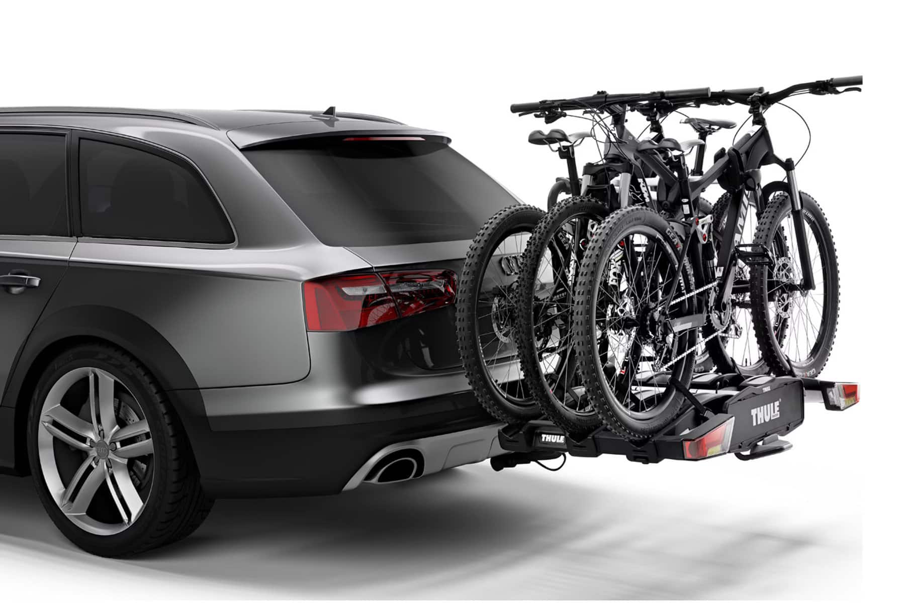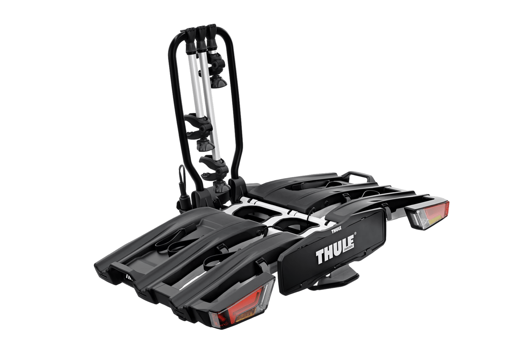 Der EasyFold XT von Thule ist als faltbarer Fahrradträger extrem flexibel einsetzbar. Selbst bei voller Zuladung ist mit einem Abklappmechanismus möglich, den Kofferraum zu öffnen. Jedes Fahrrad ist durch Rahmenklemmen gesichert. Der Anschluss an das Fahrzeug erfolgt über einen 13-pin Stecker. Die Fahrräder sowie der Träger sind zudem über Schlösser vor Diebstahl abgesichert.